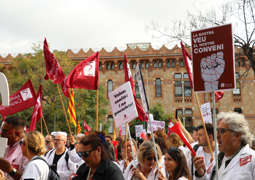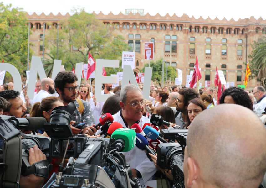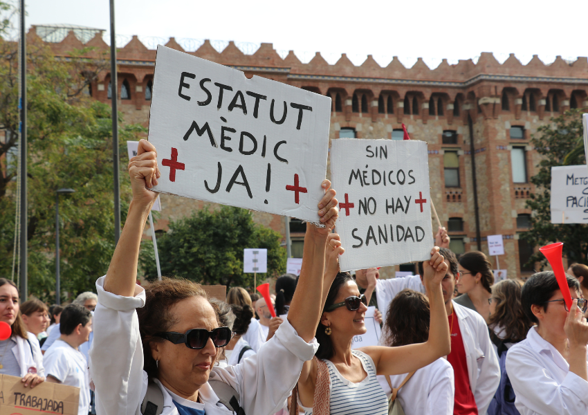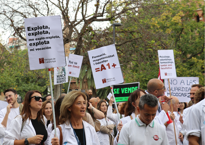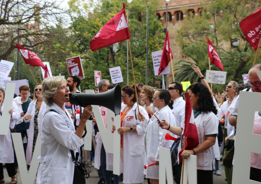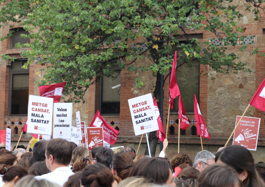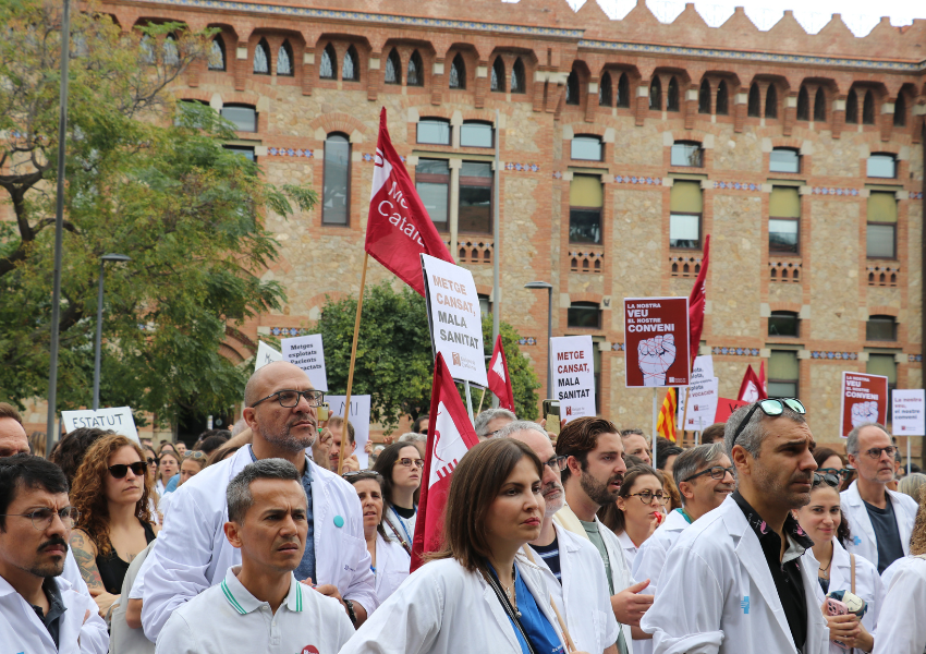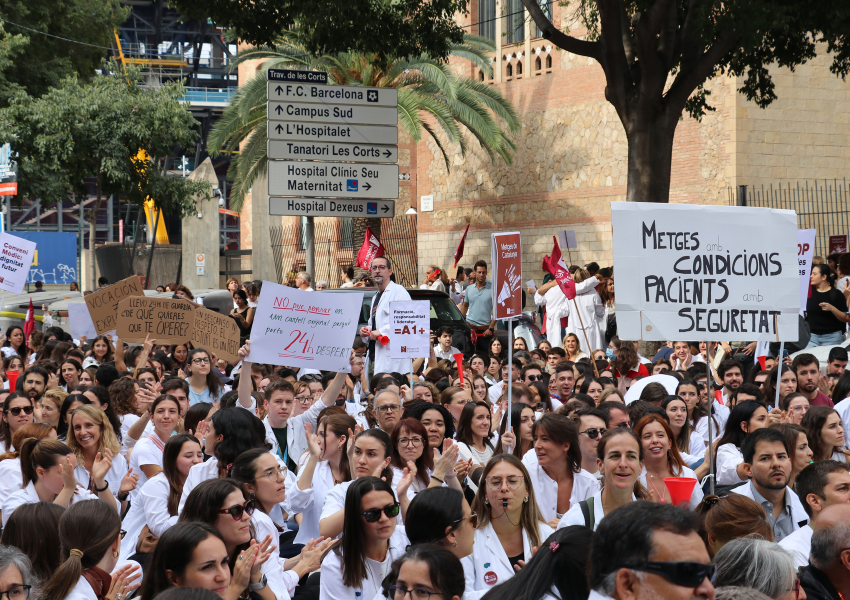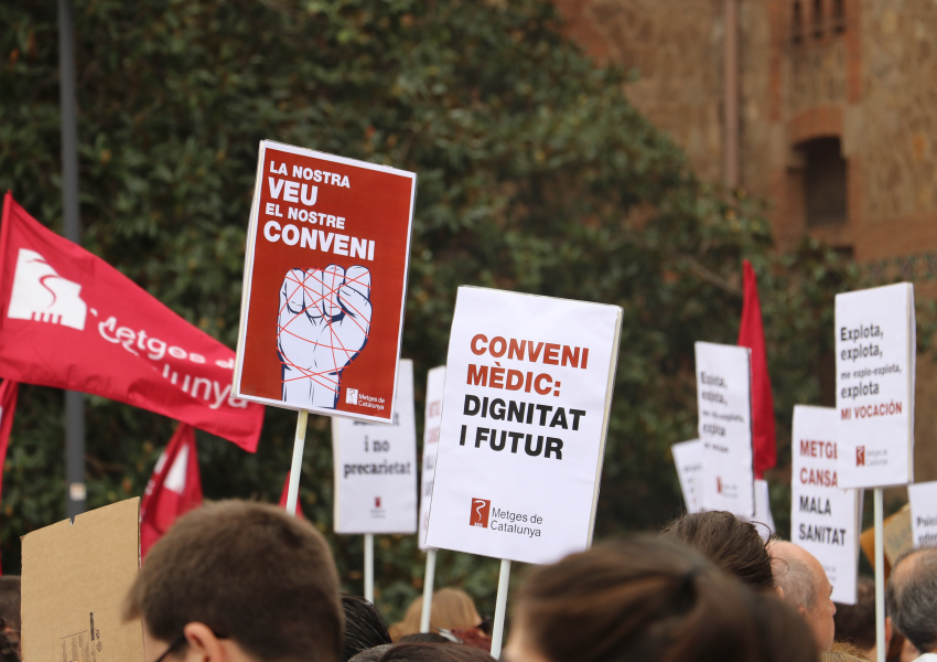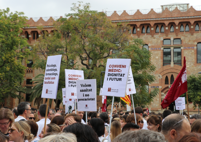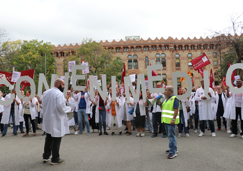 La concentració ha tingut lloc davant el Departament de Salut, on la consigna més escoltada ha estat la reclamació d’un conveni propi per al personal facultatiu, per mitjà del qual els representants del col·lectiu puguin negociar directament amb l’administració les condicions professionals, laborals i retributives que afecten específicament els metges i metgesses.
