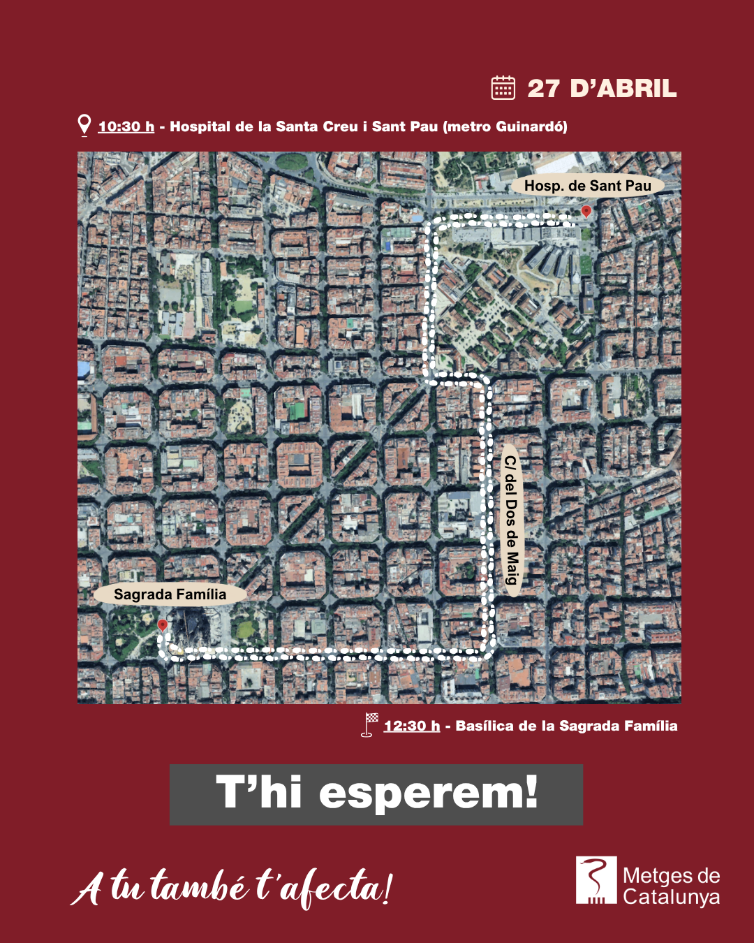 A partir de las 10:30 horas, las batas blancas saldrán del Hospital de la Santa Creu i Sant Pau y llegarán a la Basílica de la Sagrada Familia, pasando durante el recorrido por diferentes centros sanitarios de los distritos de Horta-Guinardó y L’Eixample (Fundació Puigvert, Hospital Dos de Mayo y CAP Sagrada Familia). Una vez frente al templo diseñado por Antoni Gaudí, representantes del sindicato construirán un mural de trencadís con un mensaje reivindicativo.
